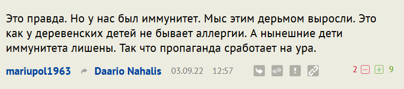 Что-то только почему-то ни я ни мои родители коммунистами так и не стали. Хотя в то время никаких Ютубов и вообще интернета где я мог легко получать альтернативную информацию не было. Так и тут будет.