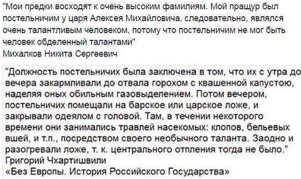 Это уже недели две как гуляет по фейсбучику. Цитата про то, в чем заключается работа постельничьих - фейковая. Но это не отменяет мудизма и тупизны Мигалкина. Радоваться и гордиться, что твои предки прислуживали в спальне - надо быть редким дбь!