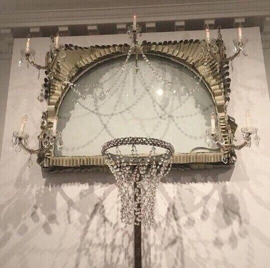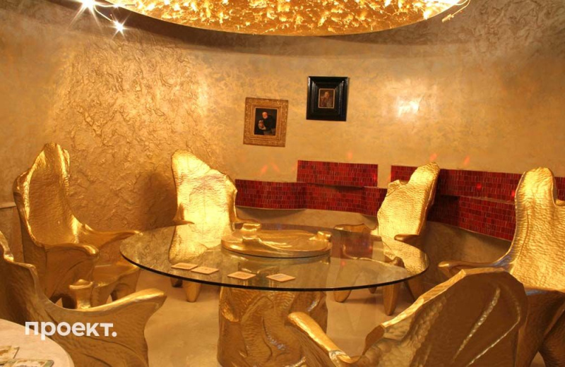 Это место строители называют «погребок». Здесь президент и гости отдыхают на позолоченных стульях, а над ними нависает люстра в виде шара. С нее свисает сусальное золото — это сделано специально, чтобы можно было сорвать лепесток.