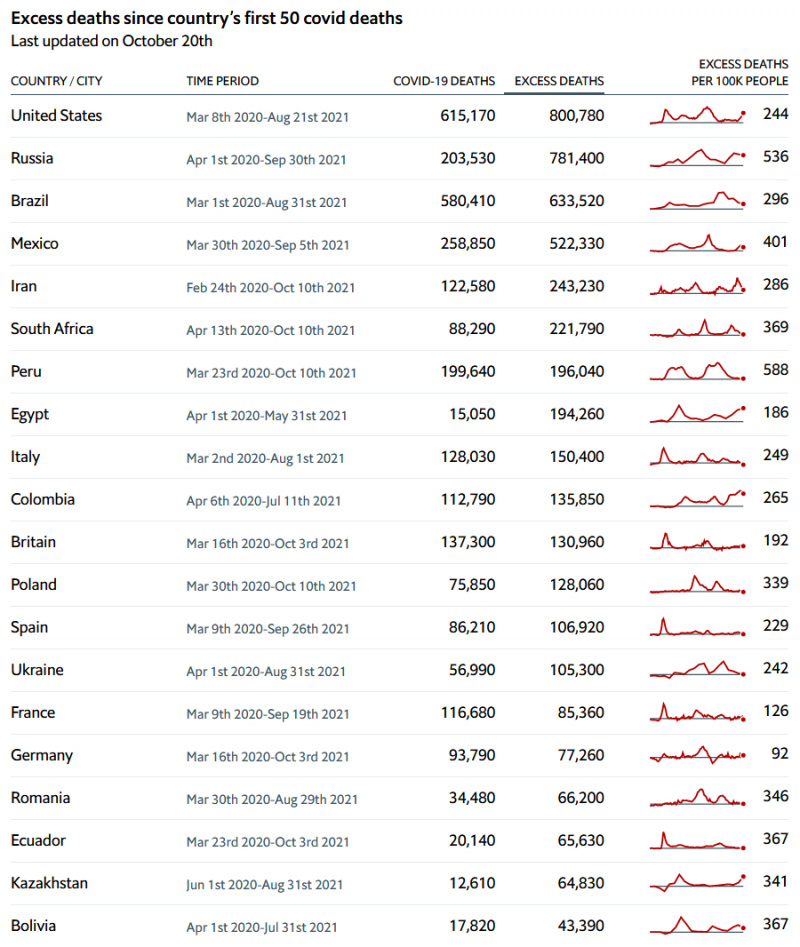 Всё-таки надо смотреть на смертность per capita - можно было отсортировать по последней колонке; плюс в единицу времени - а вот этим the Economist не заморочились, хоть данные и указаны, но считать придется самому. Сортировка просто по полному количеству избыточных смертей и на разных временных интервалах несколько искажает картину.