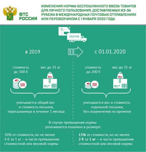 "Премьер-министр РФ Дмитрий Медведев поручил первому вице-премьеру, министру финансов Антону Силуанову обсудить в рамках Евразийского экономического союза (ЕАЭС) предложение о снижении порога беспошлинного ввоза в РФ посылок из зарубежных интернет-магазинов до €100 с 1 июля 2020 года, €50 с 1 января 2021 года и €20 с 1 января 2022 года. Об этом сообщил ТАСС пресс-секретарь председателя правительства Олег Осипов."