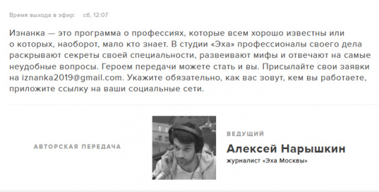 Начал слушать - очень понравилось. И людей Нарышкин находит интересных, которые действительно могут рассказать о тонкостях своей профессии, и ведет он эту передачу очень грамотно: гостю дает раскрыться, при этом задает интересные вопросы.