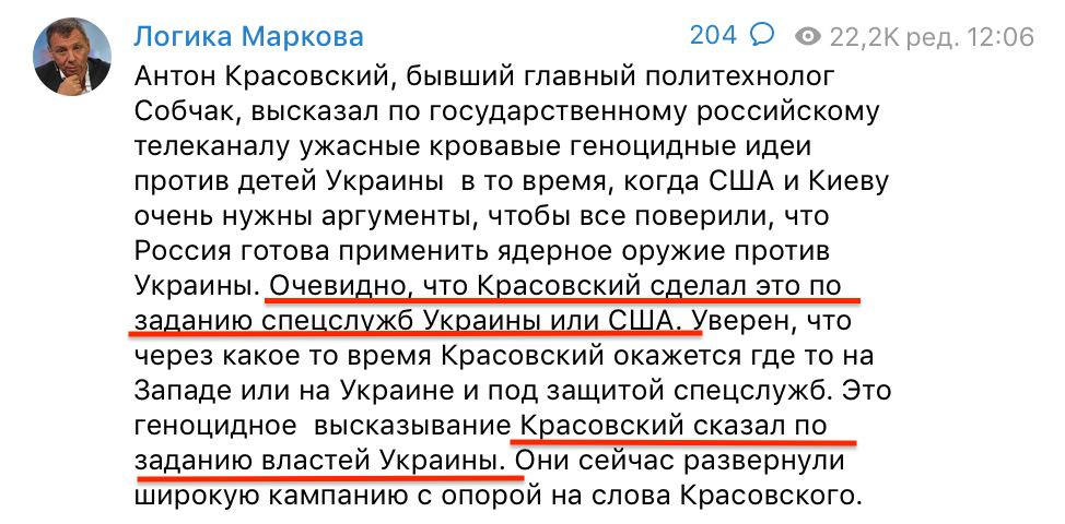 Во-первых, он написал, что ему «по-настоящему неловко», поскольку он «как-то не увидел этой границы — про детей». И он прав. Его и его коллег-пропагандистов много лет поощряли (буквально, деньгами) за то, что они делали ненавистнические высказывания самого разного рода. И никакой границы никогда не было. Не то что «можно», а нужно было по работе говорить о «деукраинизации» (в РИА «Новости»), о «сжигании сердец геев» (на «России-1») и о «радиоактивном пепле» (там же). Самому Красовскому приходилось высказываться о том, что следует топить участников протестных акций в Фонтанке. С чего вдруг отдельно про детей Украины стало не нужно и невозможно? Откуда взялась граница?