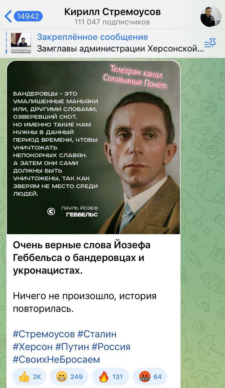 «Человек, совершивший подобное, по своей разрушительности мало с чем сравнимое действие, должен быть немедленно задержан и в кратчайшие сроки осужден по максимальной строгости закона. Человек, произнесший такие слова, как "топить детей", «забивать в хату и сжечь», на мой взгляд, предал всех нас, предал Родину, народ, сражающийся за право на жизнь для российского и украинского народов, а по большому счету - за право на свободную жизнь для всей нашей цивилизации. Он преподнес в дар врагу не просто какое-то информационное оружие, он подарил ему настоящую информационную ядерную бомбу. И такое нужно карать немедленно и предельно».