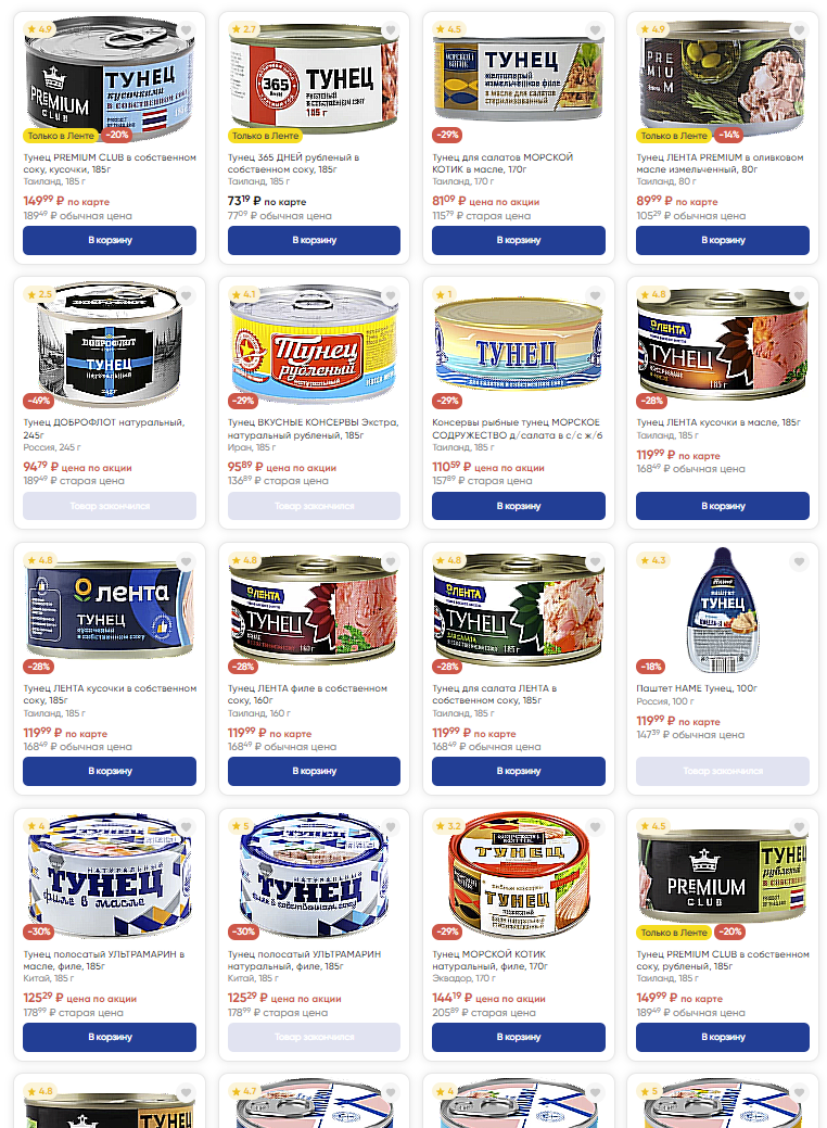 почему должны? В разных странах разный набор товаров, определяемый разными пишевыми предпочтениями. Тунец а Росси и правда не является предпочтительным продуктом. Но на полках Ленты есть даже больше одного наименования консервов из тунца.