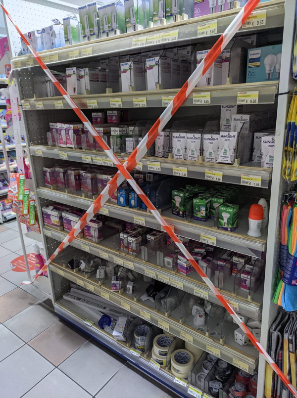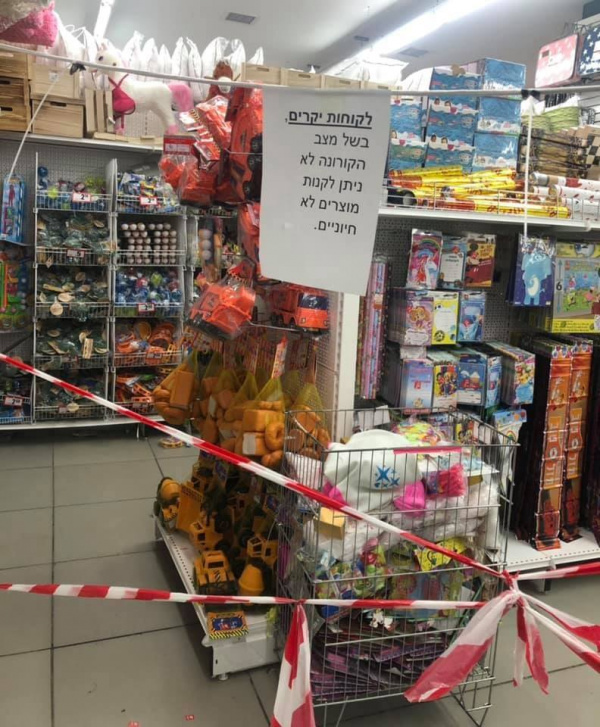 На фото табличка в одном из магазинов крупной сети хозяйственных товаров. Надпись на иврите: "уважаемые посетители, в связи с короной невозможно купить товары, которые не являются жизненно необходимыми". Совсем рядом, в обычном супермаркете, без каких либо табличек, сотни людей толпятся у касс и покупают все, что им вздумается.