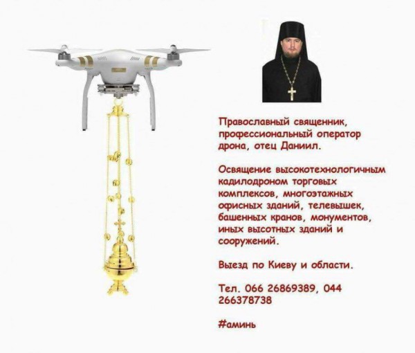 А и действительно, как по-хорошему-то освящать телевышки, башенные краны и прочие монументы? Просто снизу помахать - тут никакой благости не будет. А вот профессиональный православный оператор кадилодрона все сделает, как надо. Наверняка он умеет дроном колебать кадило с нужной амплитудой, чтобы ни грамма благодати не расплескалось.