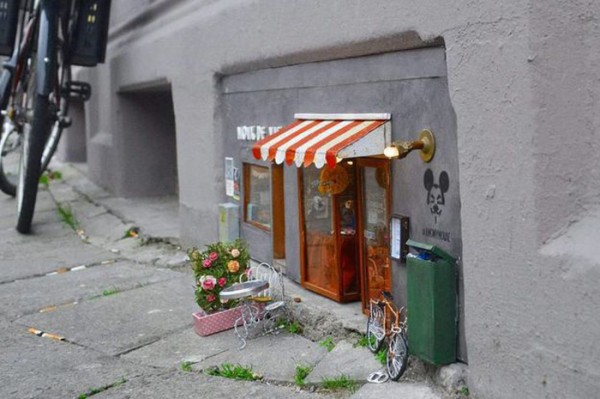 Как сообщает Gottstat.com со ссылкой на The Huffington Post, миниатюрная инсталляция представляет собой мельчайшую «пекарню» и магазин с сыром и крекерами - как раз под размер мышей. (Отсюда.)