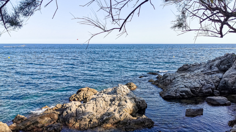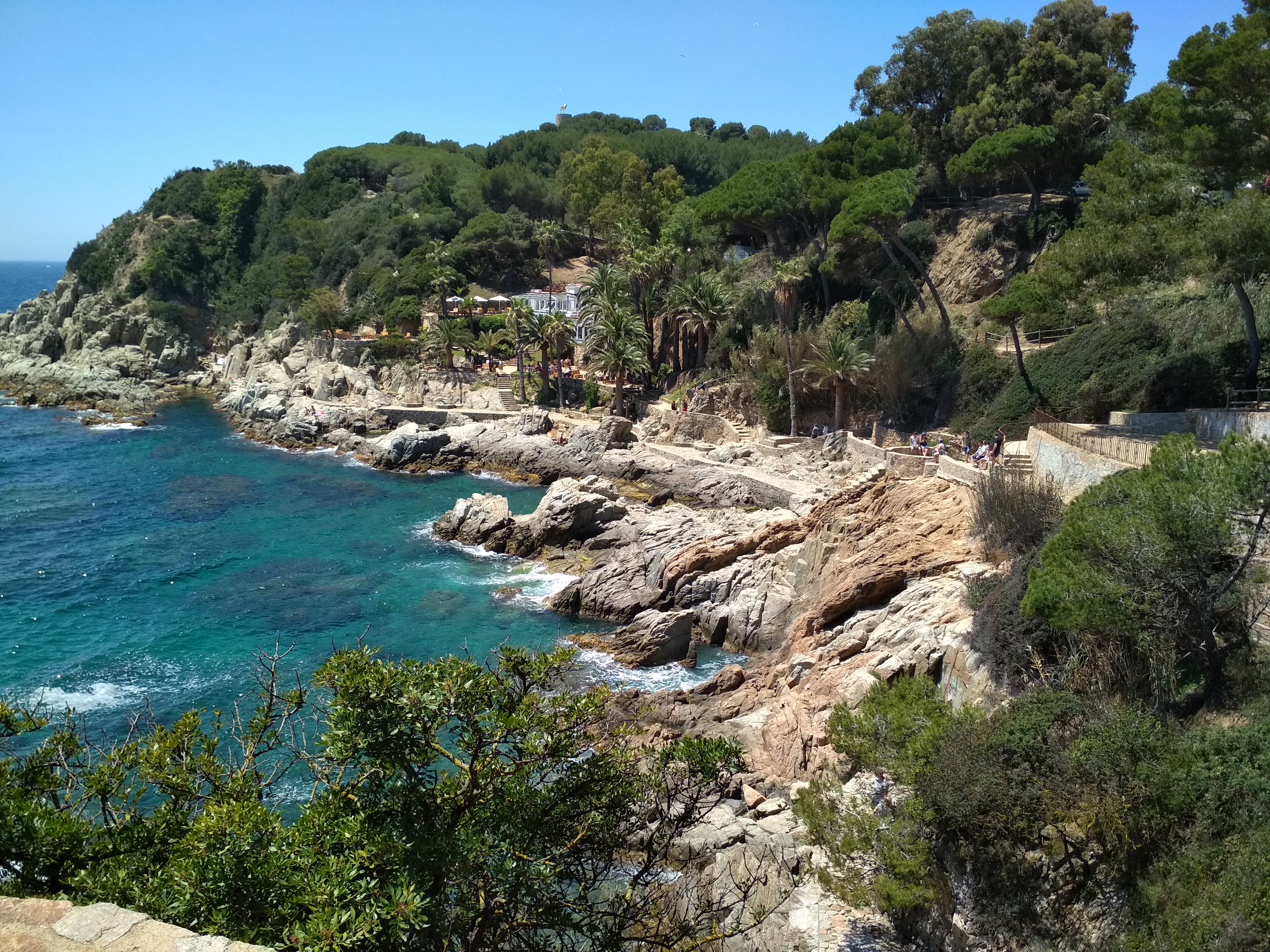 Съездили вчера в кафешку Cala Banys, расположенную в заливе Льорет-де-Мара. Там, говорят, на закате виды совершенно фантастические, но мы приехали в пять вечера, так что фантастических видов не было. Но нам и без этого понравилось.