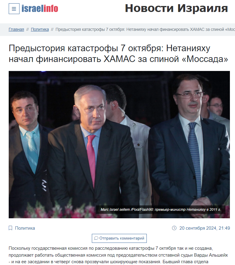 Из показаний бывшего сотрудника «Моссад» следует, что премьер-министр Нетанияху принял решение о денежных «трансферах» ХАМАСу без консультаций с профессионалами разведки и за спиной главы «Моссад» Тамира Пардо.
