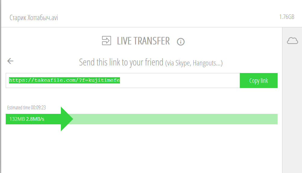А я тут наткнулся на один любопытный сервис, который эту проблему решает. Называется Takeafile. Работает предельно просто и даже не требует регистрации. Открываете страницу сервиса, в нем открываете нужный файл. (Или группу файлов - он их сам сложит в архив.) Там вас спросят, закачать ли файл в их облачное хранилище (оно маленькое, 100 МБ для нерегистрированных, 500 МБ для регистрированных), или передать получателю напрямую. Выбираете "напрямую", получаете ссылку.
