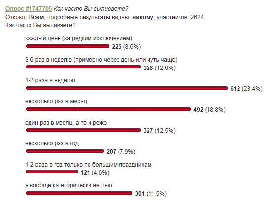 Интересный опрос на тему того, как часто вы выпиваете. Точнее, интересным он будет, когда вы все в нем поучаствуете - вот тогда выборка будет более или менее репрезентативная. Поучаствуйте, плиз. Интересны результаты. Я отметил "1-2 раза в неделю".