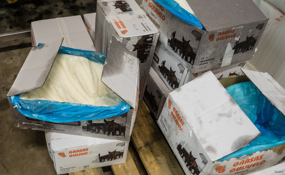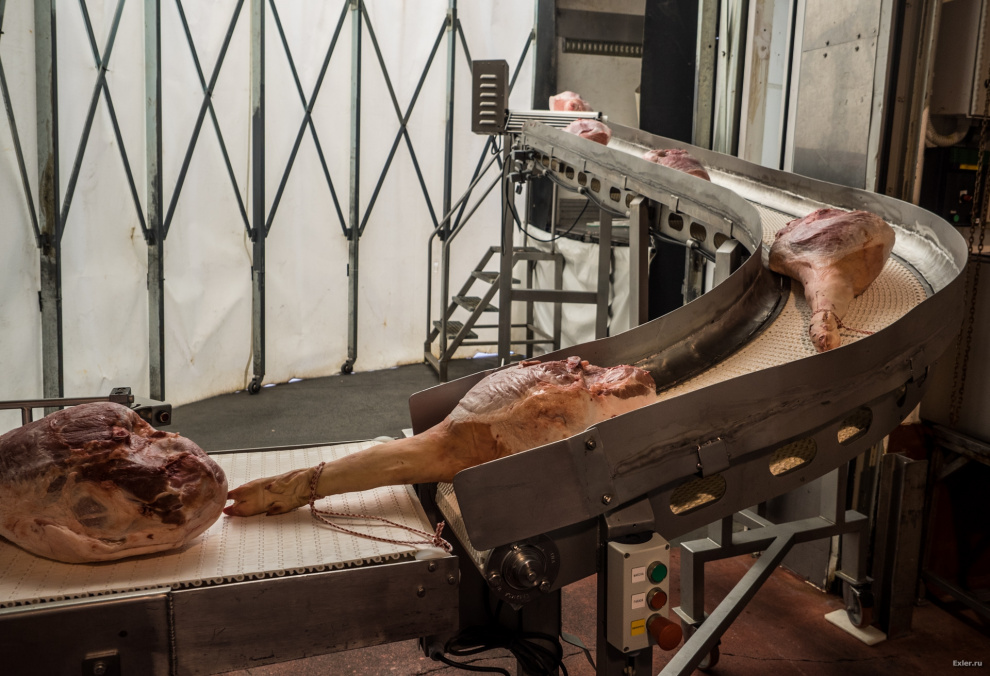 Автоматическая сортировка по весу: ляжки определенного весового диапазона попадают в предназначенный для нее контейнер. Делается это только потому, что засолка идет по формуле: 1 килограмм веса - 1 день засолки. То есть контейнер с 8-килограммовыми ляжками будет стоять в камере 8 дней, с 7-килограмовыми - 7 дней и так далее.
