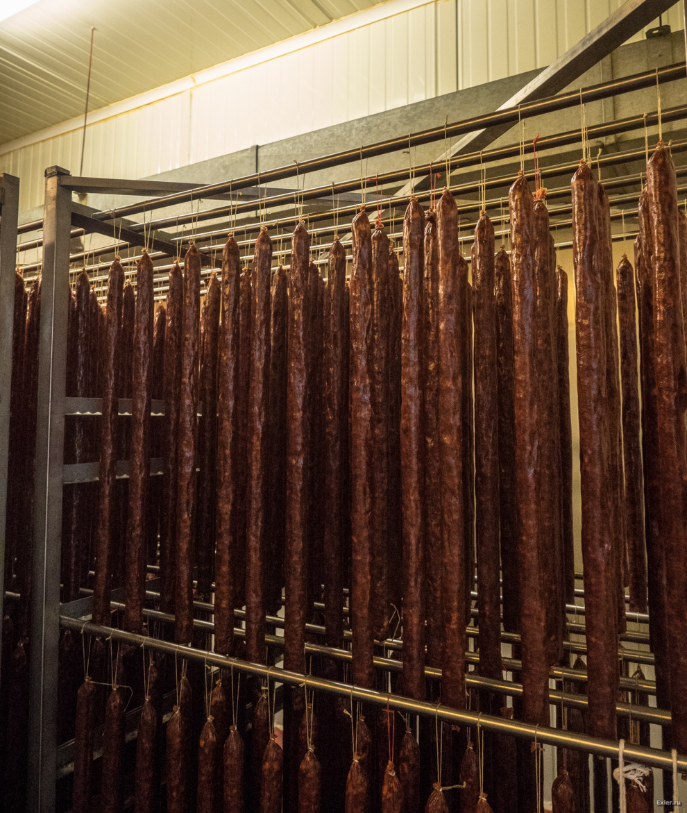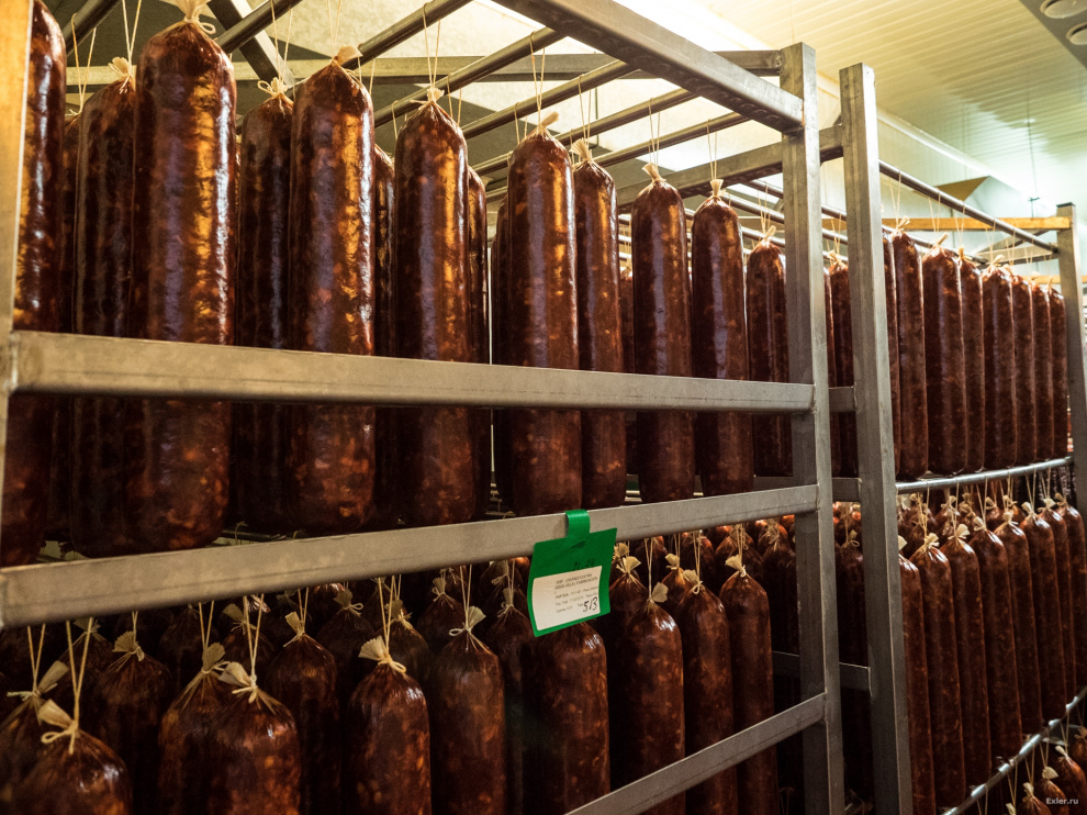 Процесс создания фарша и набивки колбас нам показали, но заснять не дали. А жаль, это выглядело довольно колоритно, особенно набивка.