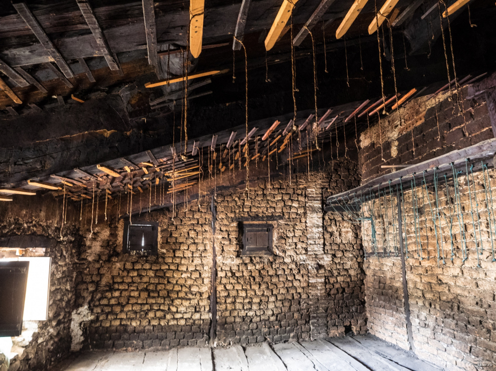 Выглядит это как-то так. Заметьте, что вдоль всего потолка идут специальные отверстия, через которые в камеру постоянно поступает свежий воздух, необходимый для качественной выдержки колбас и хамона. (Собственно, в старые времени они выдерживались в продуваемых всеми ветрами сараях.)