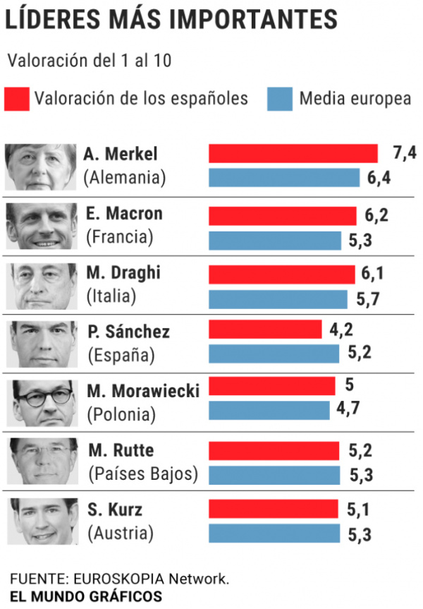 Картина складывается грустненькая: по мнению испанцев, Педро Санчес - самый слабый руководитель государства среди семи руководителей европейских стран. Педро Санчес получил оценку 4,2 - самую низкую из всех руководителей. Даже премьер Польши Моравецкий, о котором испанцы почти ничего не знают, и тот его обгоняет. Выше всех испанцы ожидаемо оценили Ангелу Меркель, Эммануэля Макрона и итальянского премьера Марио Драги.