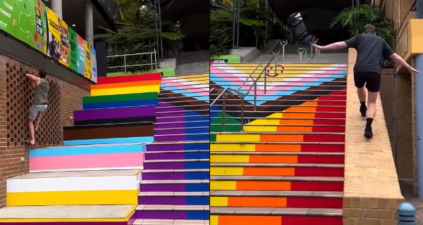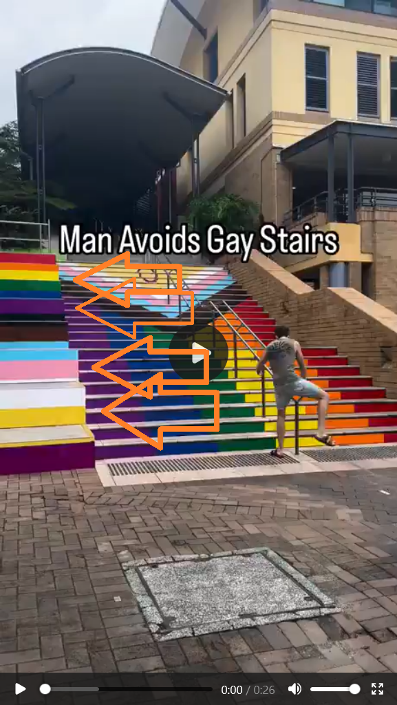 В патриотических z-каналах восхищаются безвестным австралийским героем, который мужественно полз по перилам вверх по лестнице Университета Нового Южного Уэльса в Сиднее, раскрашенной в честь Progress Pride, якобы чтобы избежать касания этой гей-лестницы ногами.