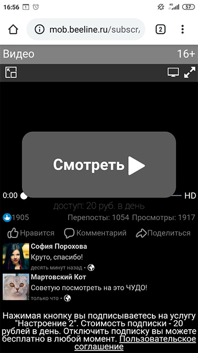 Да это прям реклама Билайна! ) Если в Мегафоне, чтобы получить подписку, не нужно не только выходить в интернет, но и даже и прикасаться к телефону, то тут нужно для того же результата совершить кучу действий: зайти на сайт, включить говновидео, проигнорировать сообщение о подписке, занимающее примерно 15% экрана. Билайн просто-таки защищает от нежелательных подписок, которые получают самые упорные!