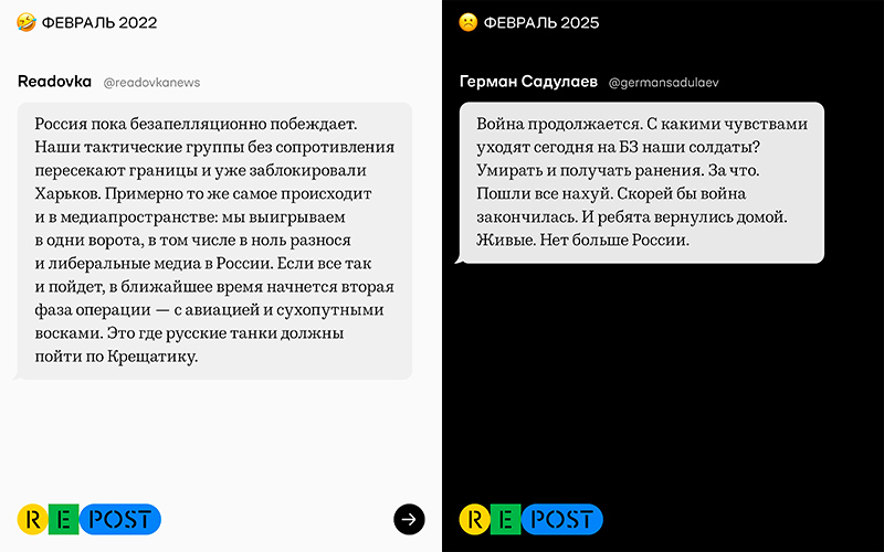 В издании Repost сделали хорошую подборку высказываний z-патриотов в начале войны и через три года войны. Очень, знаете ли, наглядно получилось.