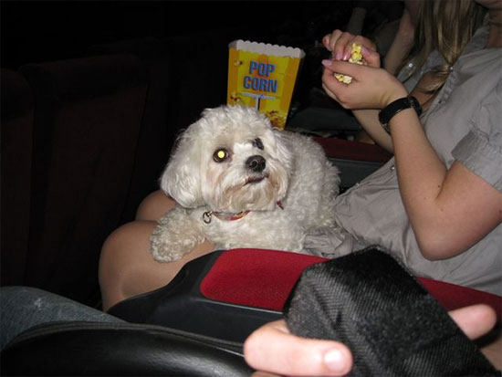 Какая же все таки уродская дура на фото! За каким тертым хреном тащиться в кинотеатр с собакой? У таких собак надо отбирать и пня под зад давать с разбегу...