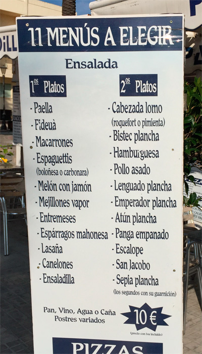 Чисто туристические рестораны обычно располагаются в первой зоне рядом с пляжем (или в туристических зонах в больших городах), и местные туда ходят редко. (Исключения, конечно, бывают, но они только подтверждают правила.) Ресторанчики для местных обычно располагаются где-нибудь во второй-третьей зоне и там спокойно может не оказаться даже английского меню, не говоря уж о русском. (А вот в туристических заведениях на побережьях Каталонии меню на русском встречается очень часто.) А в Каталонии меню может оказаться только на каталанском, что уж совсем весело и экзотично.
