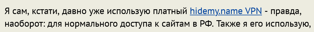 Я сам, кстати, давно уже использую платный hidemy.name VPN - правда, наоборот: для нормального доступа к сайтам в РФ. Также я его использую, когда мне нужно иметь, например, доступ к американским сайтам с американским IP и так далее.