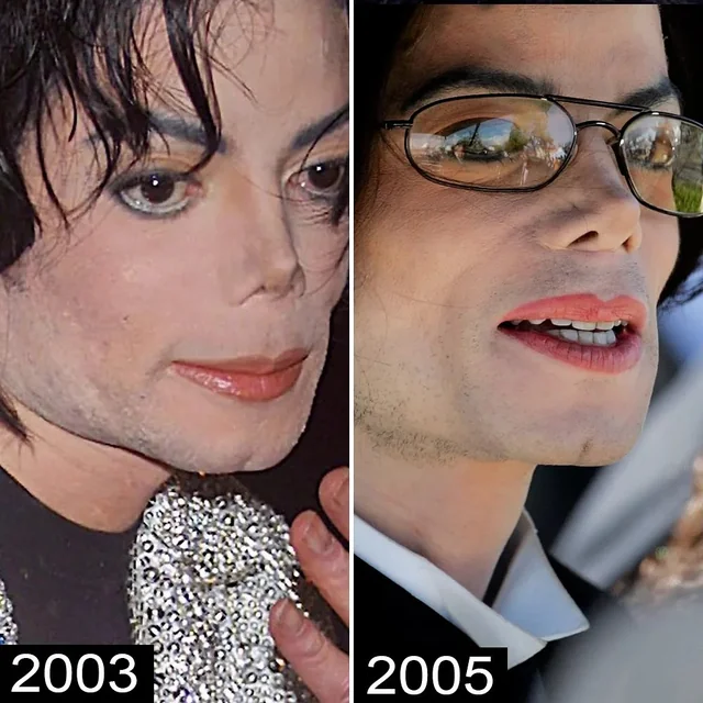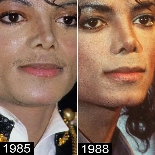 Никто бы его не трогал, если бы не нос - у него уже к 1980-му году пластика носа была. И витилиго -брехня, т.е.оно было, возможно, но явно не по показаниям. По крайней мере фото подростковые - хорошая кожа без грима. Глаза в 1983 и в 1984 - разные, неизбежное последствие подтяжки кожи; так нижнее веко опускается при базедовой болезни, но отёков нет. Парня минимум в 21 год изрезали (год даю на заживление ран и уменьшение отёков), а потом начали придумывать отмазки.
