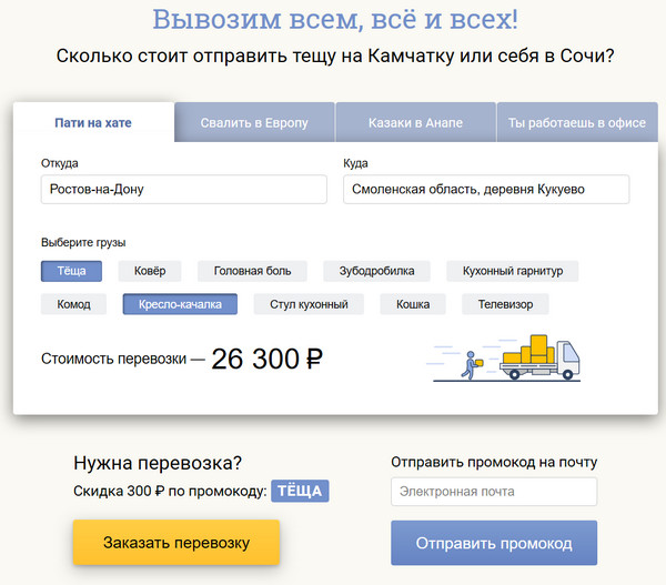 Также вы можете заранее подсчитать, во сколько это обойдется - на сайте работает веселый калькулятор, где можно подсчитать, например, сколько стоит отправить тещу на Камчатку или себя в Сочи.