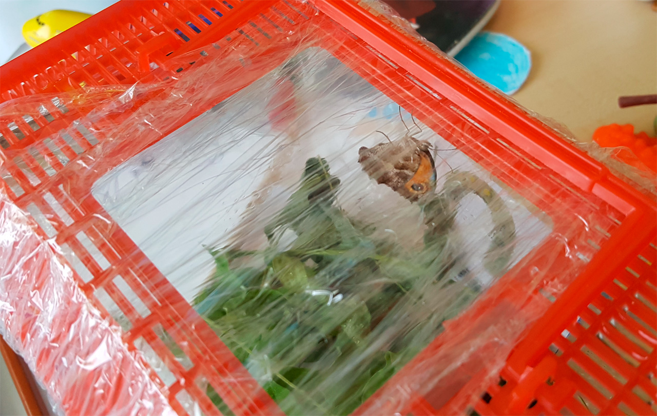 Ребёнок в саду поймал бабочку. Сделал для нее клетку из пластиковой коробки с прорезями. Накидал туда всякой травки и начал наблюдение за природой.