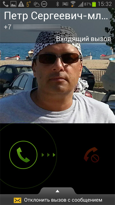 На огромной черной плашке размещены здоровенные пиктограммы приема звонка и отклонения. Очень удобно. Фотография выводится в совершенно нормальном размере. Так что ты лучше шел бы до забора докапываться.