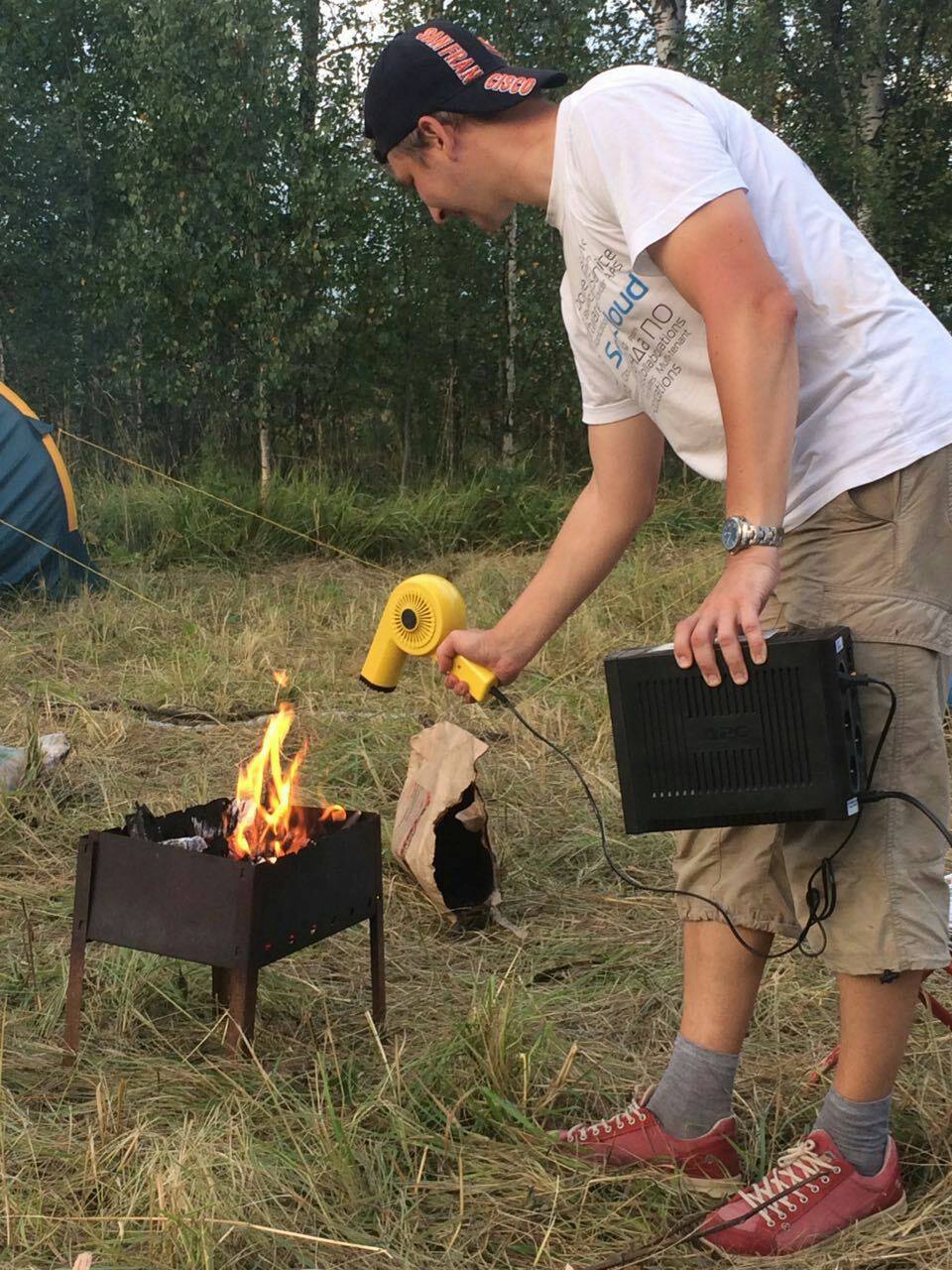Я тоже на природе угли старым феном раздуваю. А питаю его от бесперебойника 😉