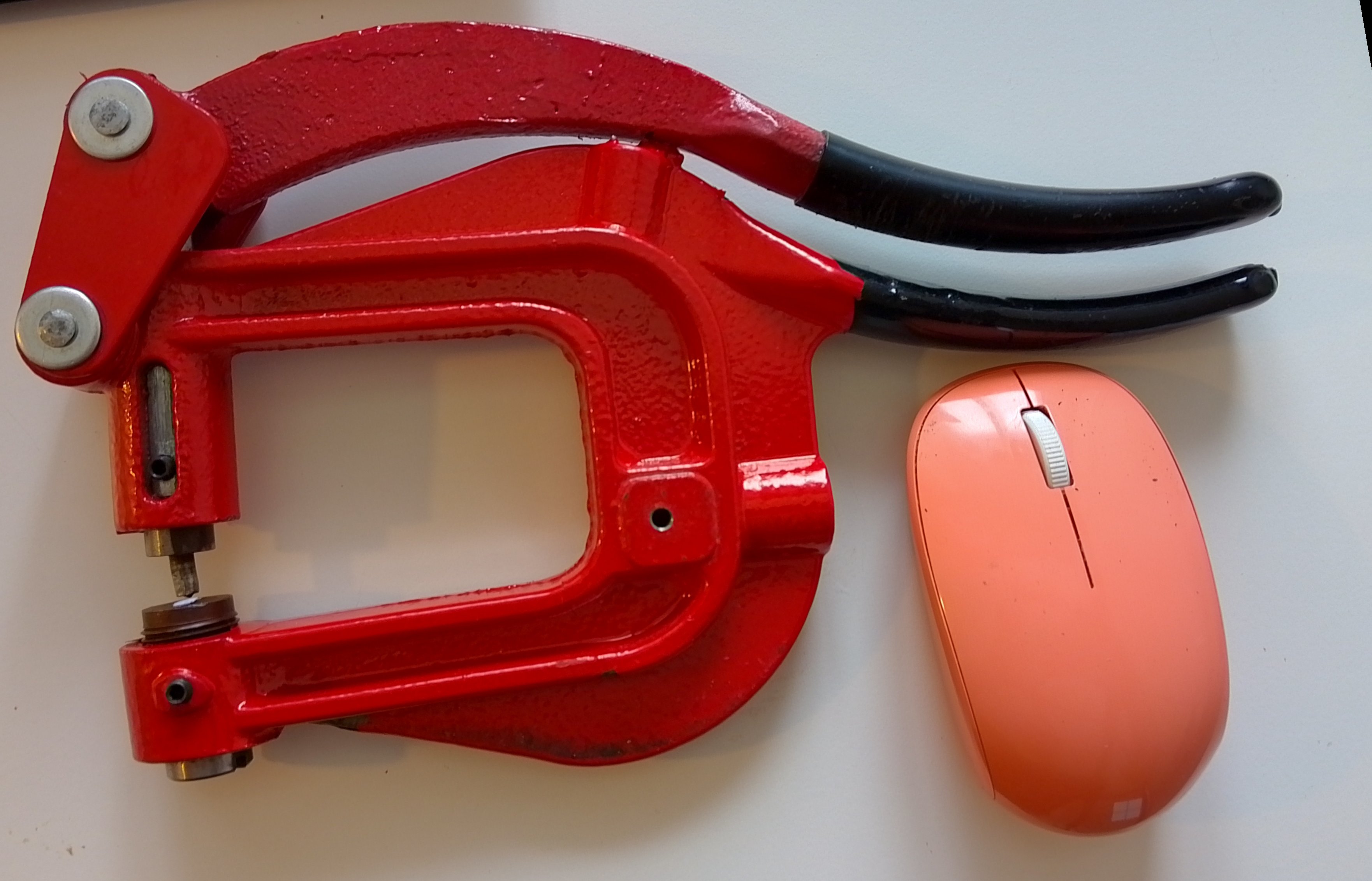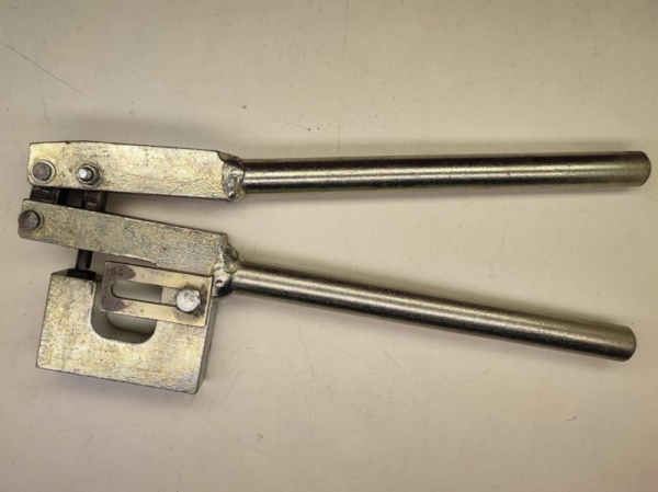Yже три рyчных пробойника разной степени доломанности. Всегда приходится зажимать в тиски и рычаг делать еще трубой -- tак как неожиданно хочется вместо оцинковки на 0.5мм (стандарт) пробить нержавейку 0.75 мм (ачотакова). Или вместо дырки на 3мм -- дырку на 7 мм. Или после 20 дырок руки устают. Китайский клон-пробойник после нержавейки 0.75 мм делает "vaschehuinya" и начинает разгибаться (Fig 1). Хоть он, гад, сотню ойро стоил. Придется его обратно сжимать струбциной как-нить и больше не насиловать так.