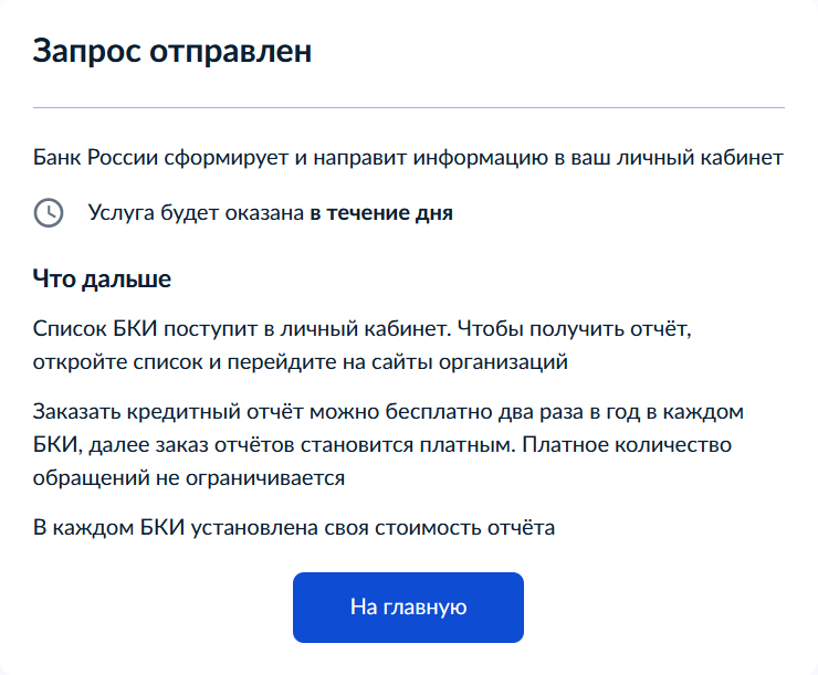 Upd: Как справедливо заметили в комментах, сначала желательно запросить на Госуслугах список тех БКИ, в которых хранится ваша кредитная история.