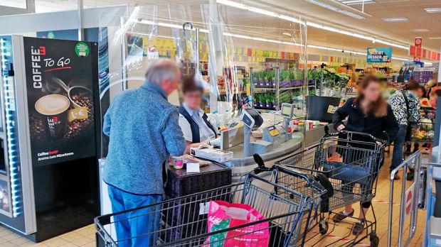 А здесь все магазины поставили импровизированные щиты из плексиглаза или прочной пленки.
