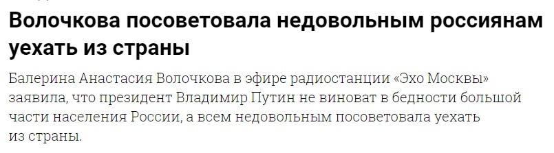 Волочкова побывала в эфире на "Эхе Москвы". Прям рекомендую почитать или послушать - совершенно незамутненное удовольствие. Птица Говорун, как известно, отличалась умом и сообразительностью, а птица Балерун - ну, в общем, сами судите, чем она отличается.