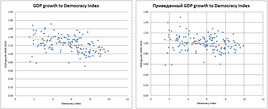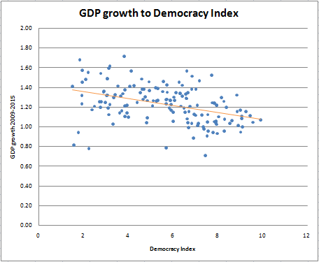 Вы путаете причинно-следственные связи. Страны с высоким уровнем демократии, это в основном страны первого мира, которые практически достигли своего пика, тогда как быстрый рост больше характерен для стран с очень низким изначальным уровнем и которым "есть куда расти".