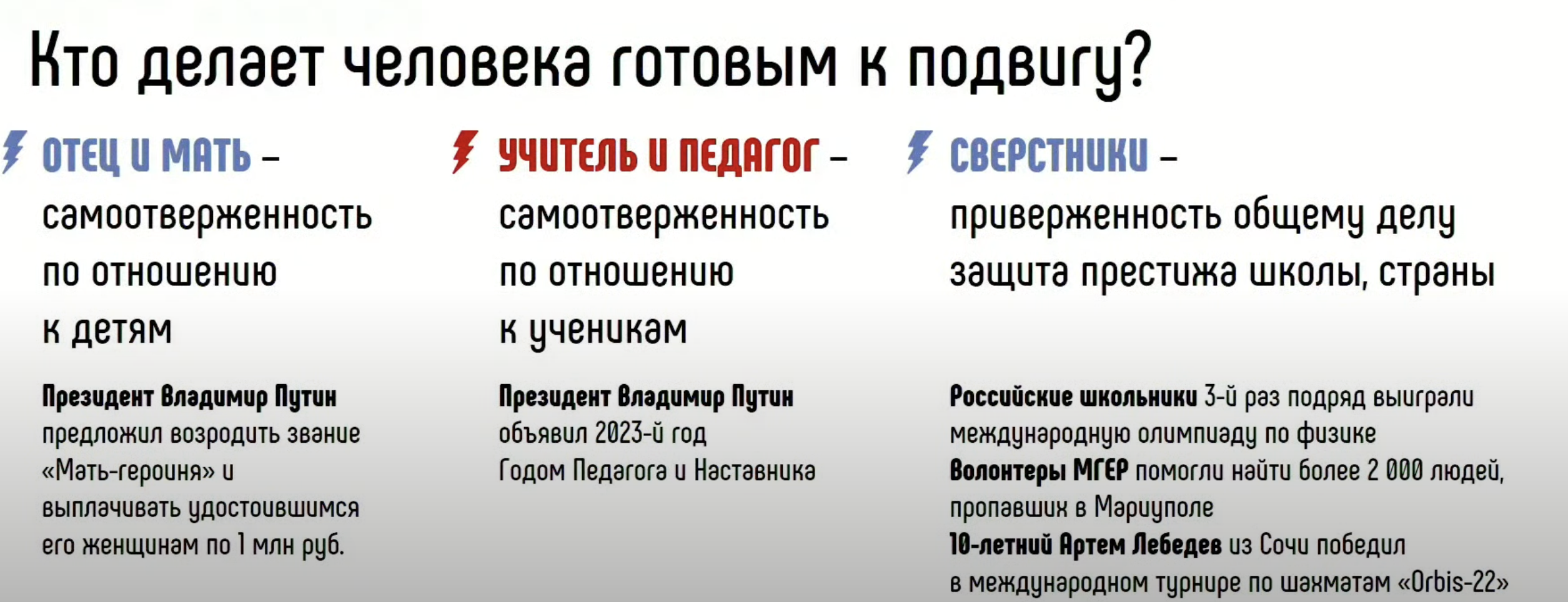 📌В августе учителей начали готовить к промыванию мозгов школьникам — для этого проводились «классные марафоны». Из них становится понятно, какую информацию будут подавать детям. Например, один из «наставников», член Общественной палаты Москвы Александр Асафов, повторил учителям все нарративы российской пропаганды — о демилитаризации и денацификации Украины, геноциде жителей Донбасса и сплочении вокруг Путина. По мнению эксперта, достоверную информацию для ребенка нужно брать с сайтов президента России, общества «Знание» и из брифингов пресс-секретаря Минобороны Игоря Конашенкова. Детям отныне предлагается «служить отечеству вместо потребительства».