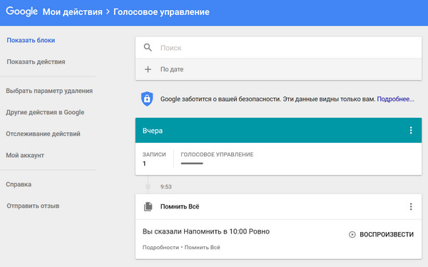Я голосовым сервисом Google пользуюсь только через напоминалку "Помнить все" (хорошая штука, кстати) - вот Google мои напоминалки и хранит за каким-то чертом. Также он хранит записи всех случайных вызовов голосового сервиса Google - и вот там уже может проскакивать какая-то конфиденциальная информация, потому что в этот момент он пишет все, что происходит вокруг.