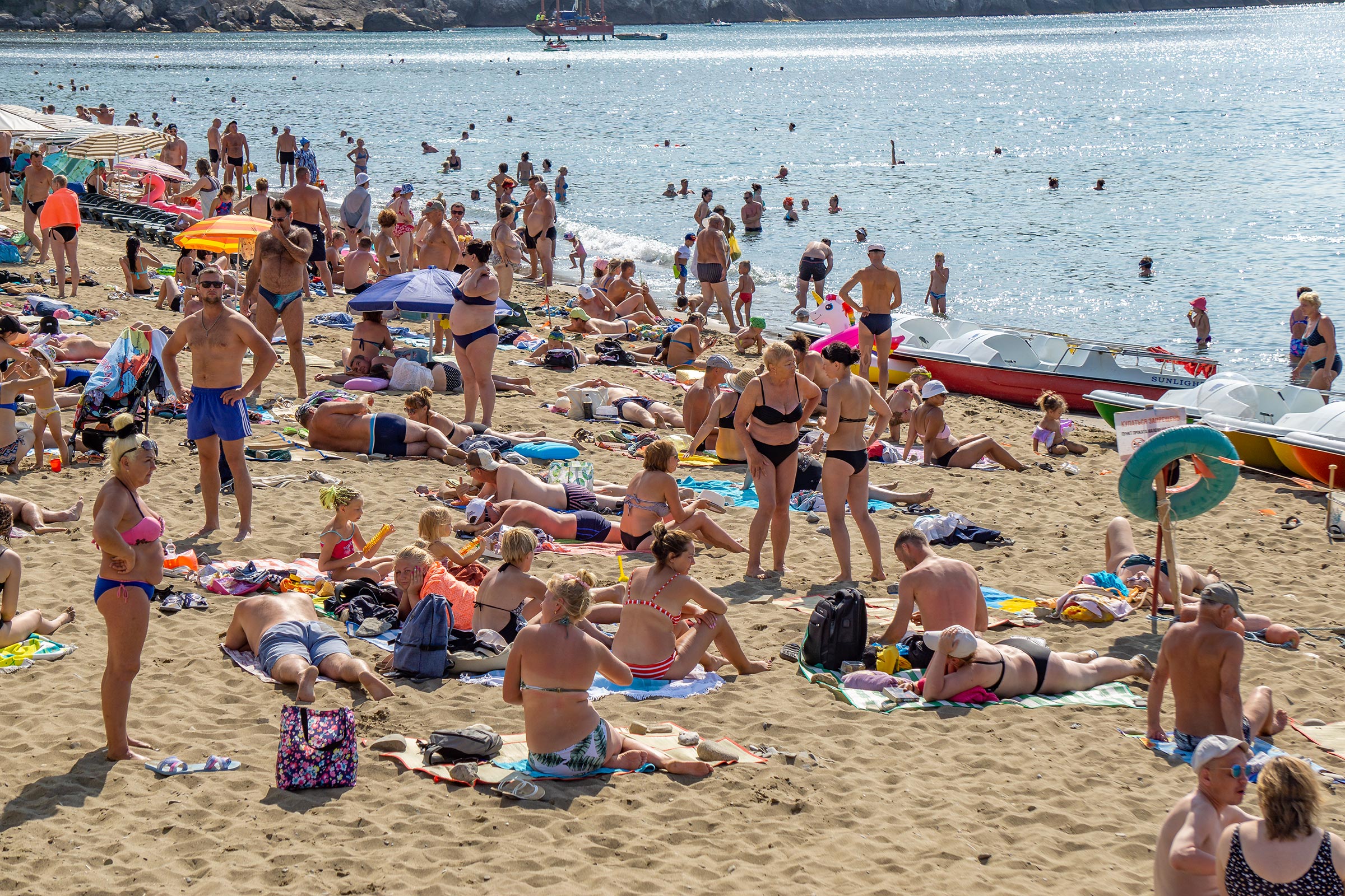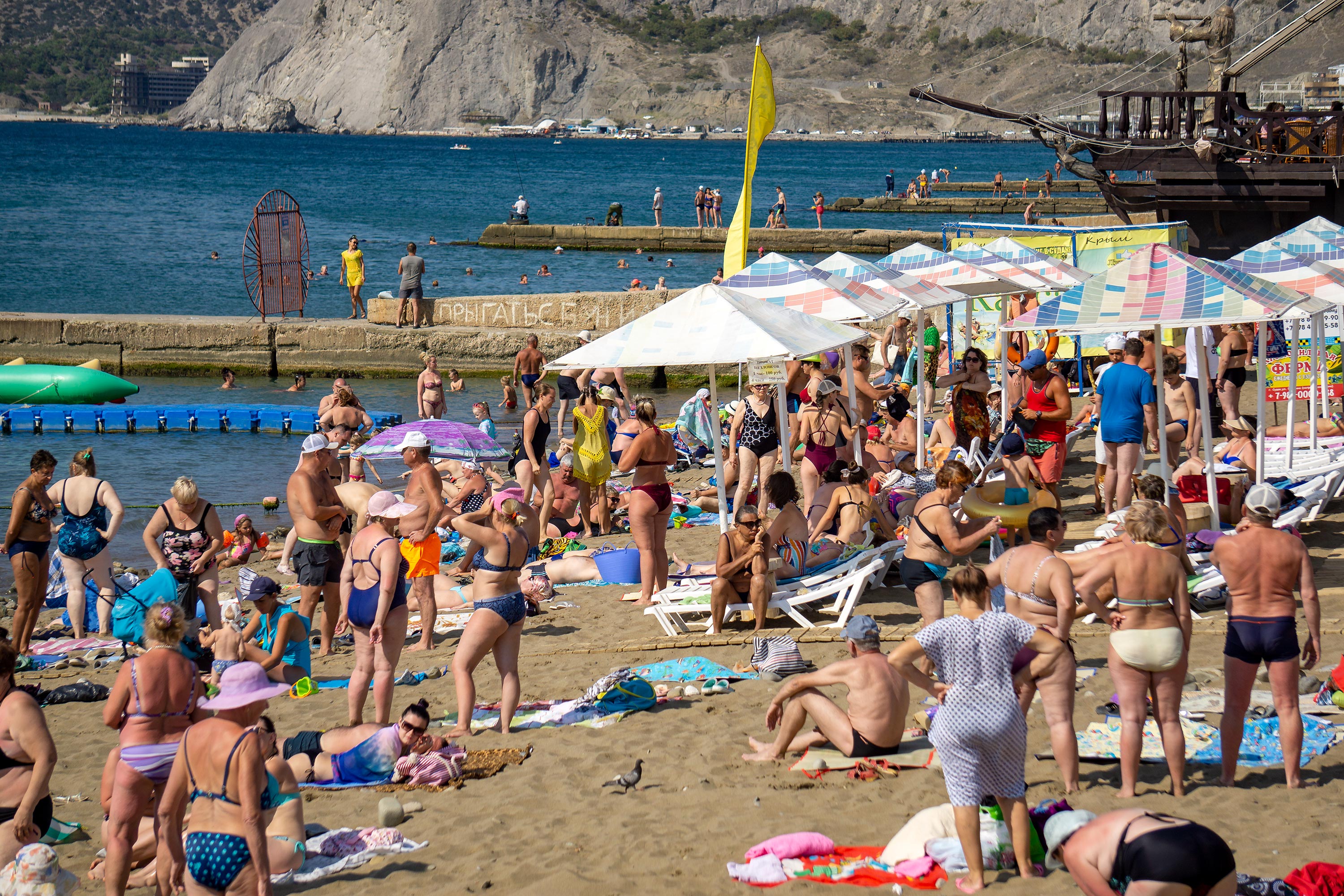 Пляж в Судаке неделю назад. Что там творилось в августе, несложно представить. Однако, прилетевшим из Симферополя никакой тест сдавать не нужно. И толку, проверять прилетевших из-за границы? Потому что отечественный вирус добрее заграничного и уничтожается вакциной "Спутник"?