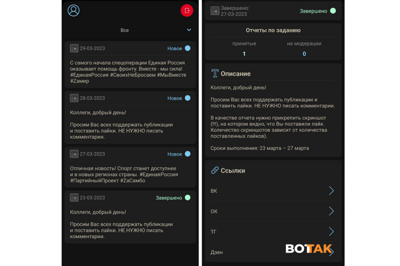 Раньше, по его словам, партийный софт действительно использовался для продвижения кандидатов, их информационной поддержки и других активностей в выборный период. Сейчас же задания в основном связаны с войной и ее поддержкой, говорит собеседник «Вот Так», называя приложение «фабрикой троллей, но бесплатной и из бюджетников».