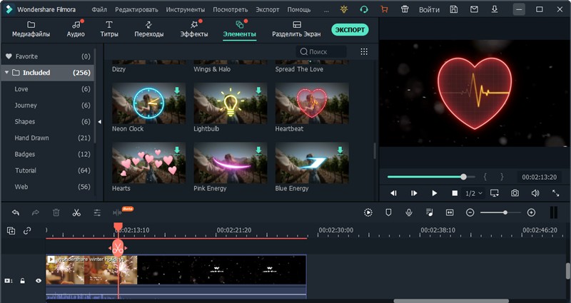 Добавьте своё видео в приложение, перетащите ролик на временную шкалу. Начинается волшебство! В версии Filmora каждому пользователю доступен базовый набор эффектов.