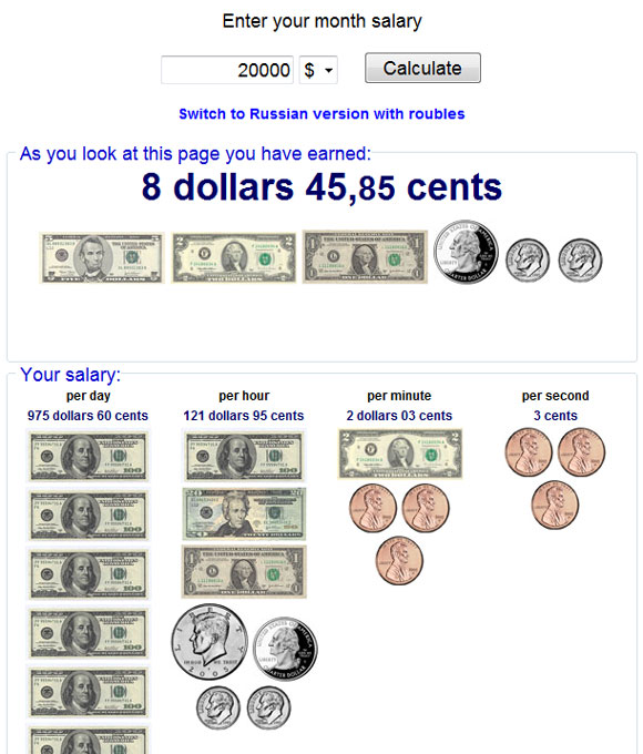 Забавный и полезный сервис - Бабло. Вводите свой ежемесячный заработок - хоть в долларах, хоть в евро, хоть в рублях. После этого получаете информацию о том, сколько зарабатываете в день, час, минуту и секунду. А главное - сколько денег вы уже профукали, сидя и пялясь в эту страницу. Очень полезно открывать этот сервис, вводить данные, потом идти читать блоги или форумы, а после этого смотреть, сколько натикало - впечатляет, между прочим.