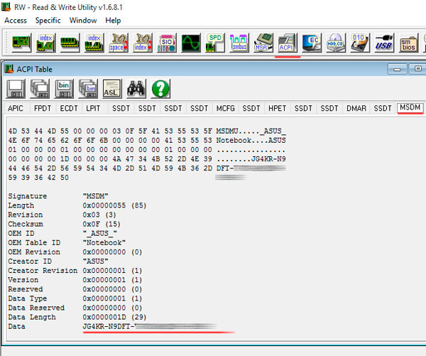 Скачали, установили, запустили. Нажимаете вкладку ACPI, внутри вкладку MSDM. И вот он, лицензионный номер!