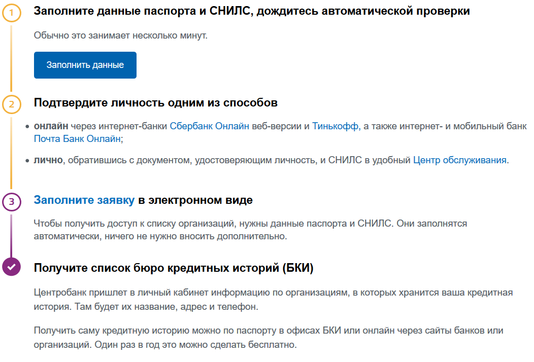 - Нужно узнать у ЦБ РФ, какие кредитные бюро имеют твою историю. Новость в том, что теперь это можно сделать на госуслугах, а раньше нужно было проходить хитрую платную регистрацию на сайте ЦБ РФ. Это, как я понимаю, можно делать бесплатно хоть каждый день.