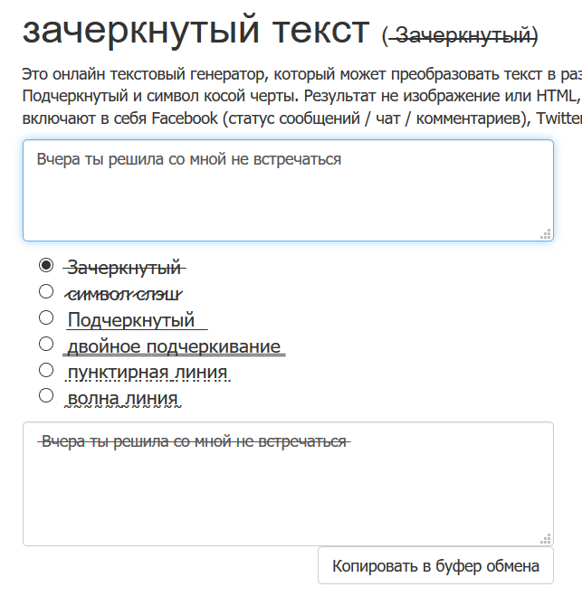 Теперь с кириллицей. Вот этот сервис. Жирного и наклонного нет, зато зачеркивание, заштриховывание, несколько видов подчеркиваний. При этом нельзя по-разному выделять слова: только одно слово или целый блок.