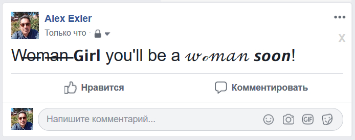 Обычный пост в Facebook создается в самом примитивном текстовом редакторе, в котором нет возможности сделать текст жирным, наклонным, зачеркнутым, заштрихованным, подчеркнутым волнистой или двойной линией. А иногда такое бывает очень нужно.