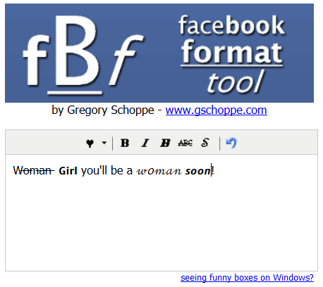 Сервис номер один - Facebook format tool. Внимание - работает только с латиницей, с кирилицей не работает. Есть жирный, наклонный, жирный наклонный, рукописный, зачеркнутый и всякие смайлики. Вводите текст там, расцвечиваете, копируете в буфер, вставляете в Facebook.