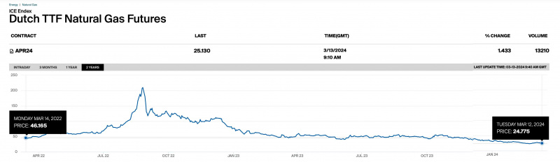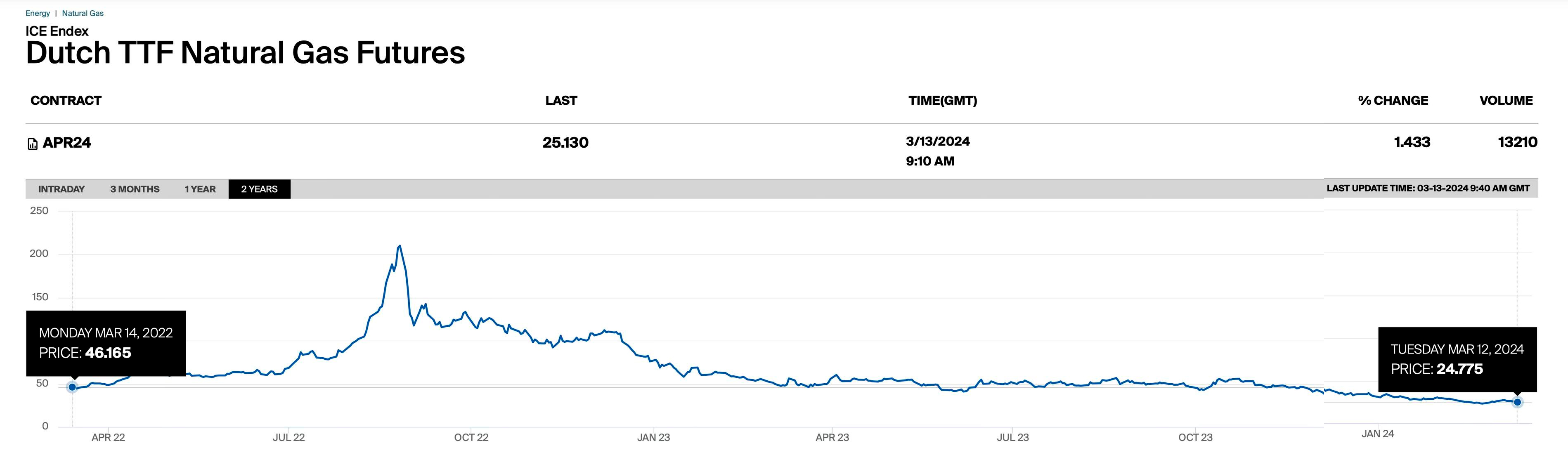 График стоимости газа в Европе за два календарных года. Констатируем, с апреля 22-ого газ подешевел практически вдвое. С 46 до 25-и. Причем надо заметить, что вплоть до декабря 2023 российский газ в Европе был. До сентября 22-ого вообще ещё Северный поток был и по нему газ качали. Сейчас его нет. И никто как-то не замёрз, несмотря на все путинские прогнозы.