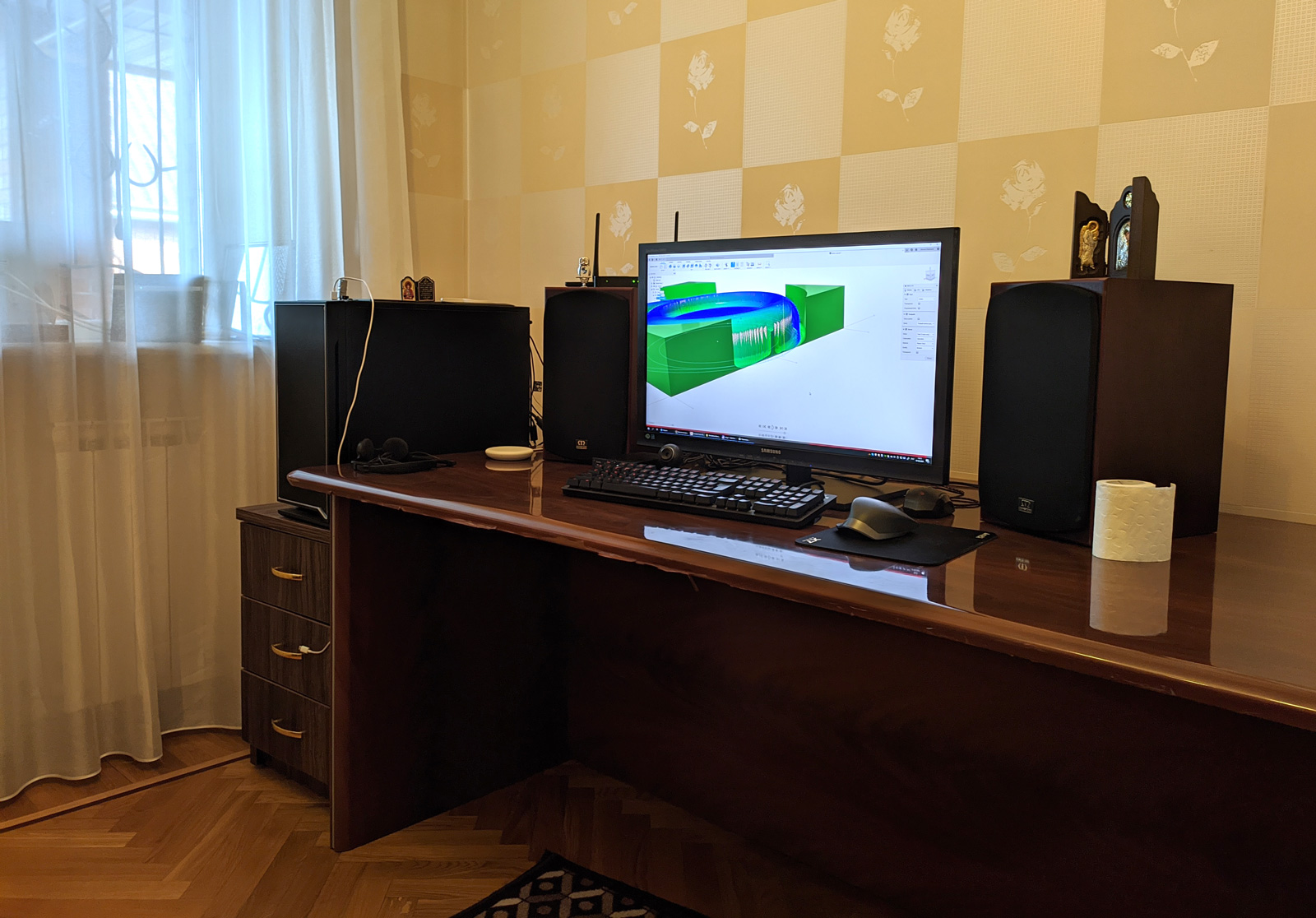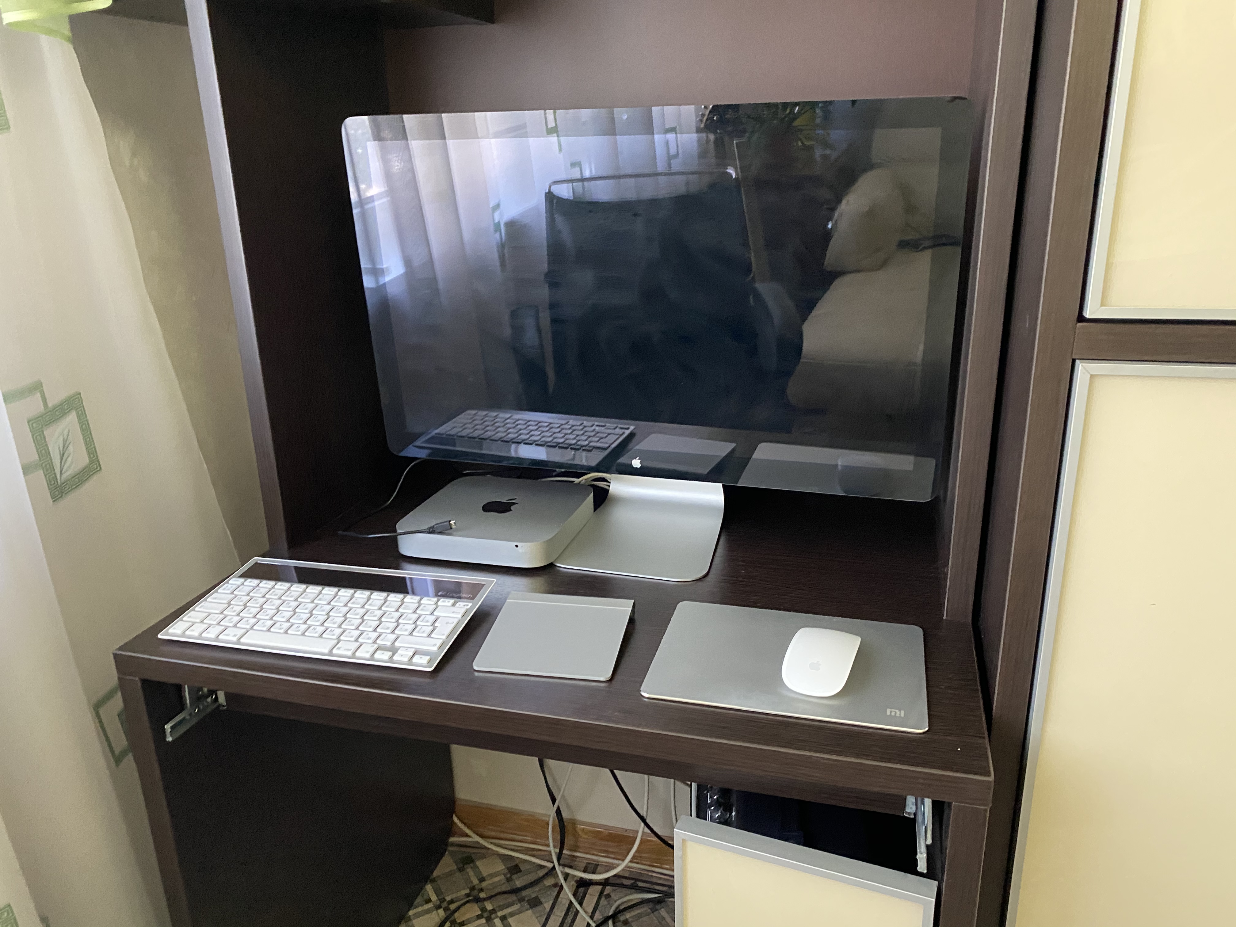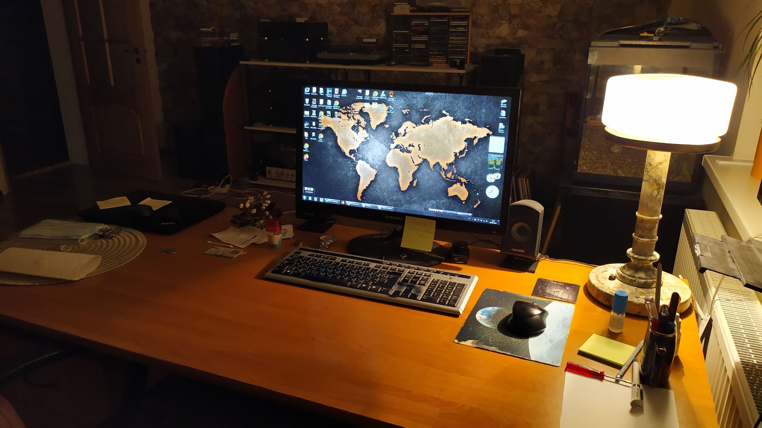 Работаю из офиса - там все платы и пристойные машины. Из дома - телеконференции и по мелочам что-нибудь посчитать. Так что вот такой закуток. Аквариум только что купил и поставил, но он ещё пустой - аквариумные магазины были закрыты из-за пандемии.
