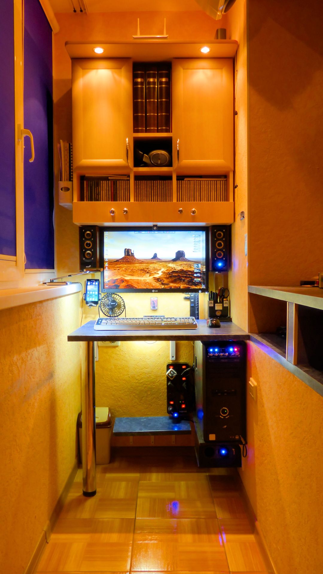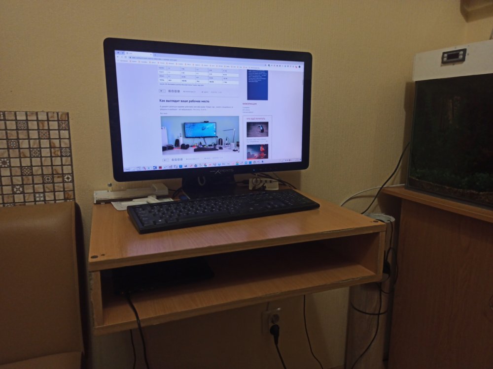 У меня дома места мало. Есть на кухне закуток, где я приделал к стене столик, на который еле компьютер помещается (моноблок).